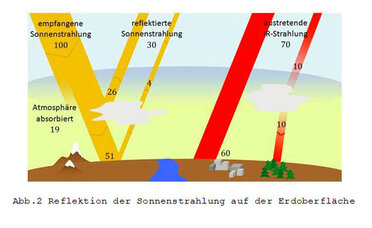 In Abbildung 2 ist die Bilanz der Strahlung der Sonne auf die Erdoberfläche dargestellt. Wenn von 100% kurzwelliger Strahlung von der Sonne auf die Erde ausgegangen wird, dann werden 19% von der Atmosphäre absorbiert, 30 % reflektiert und 51% an der Erdoberfläche und den Ozeanen absorbiert. Die an die Erdoberfläche absorbierte Energie wird in langwellige Wärmeenergie umgewandelt. Diese Umwandlung in langwellige IR-Strahlung ist nur auf Grund ihres räumlichen Molekülaufbaues bei 3- und mehratomigen Gasmolekülen möglich. Diese Energiemenge wird Albedo genannt und ist letzten Endes für die Temperatur auf der Erde verantwortlich. Die Rückstrahlung wird von der atmosphärischen Lufthülle nach dem Lambert – Beherrschen Gesetz absorbiert. Nach diesem Gesetz ist die absorbierte Energie umgekehrt logarithmisch von der Konzentration des absorbierenden Gases (Kohlendioxid) abhängig.